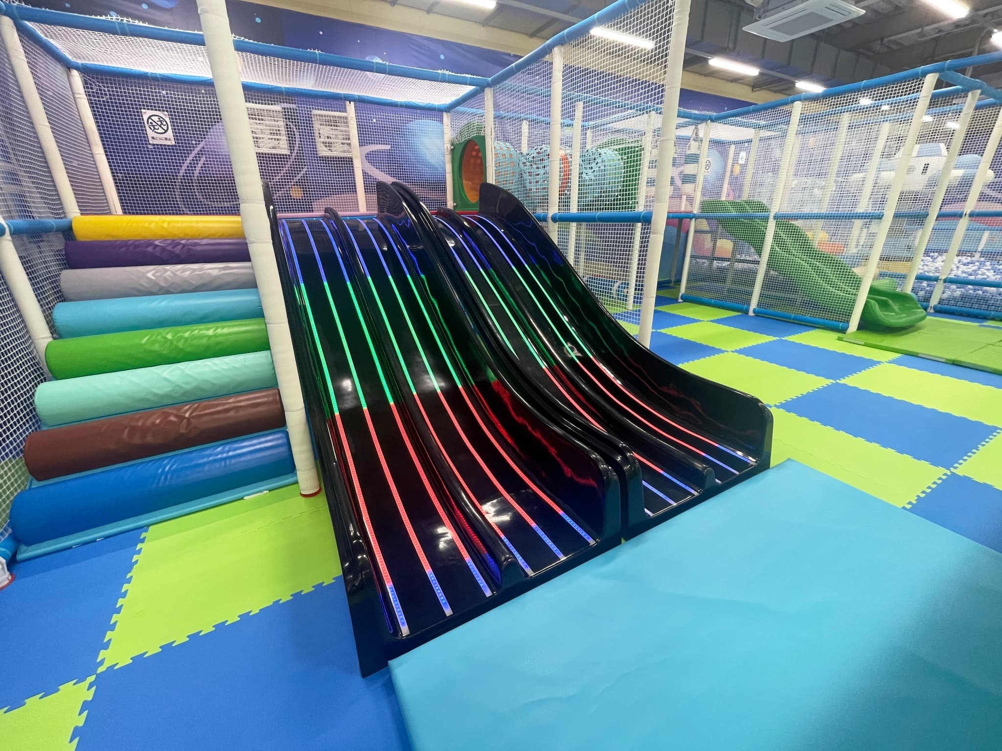 巨大ジャングルジムの中にはライトが光るすべり台やトンネルなど、ワクワクする仕掛けが盛りだくさん。