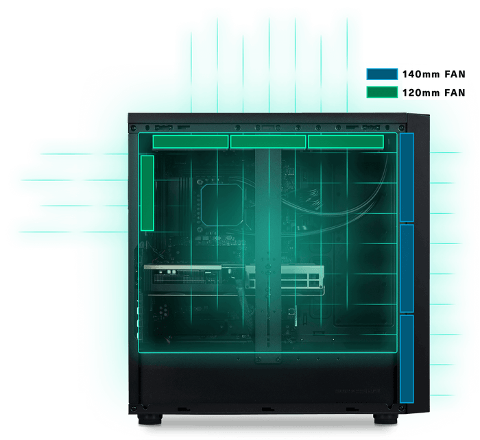 フロントに140mmの大型ファン3基、リアに120mmファン1基を標準搭載しています。 内部のパーツを効率よく冷却するために、フロント吸気、トップ・リア排気を採用し、強力なエアフローを実現します。
