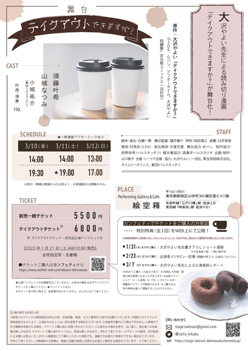 大沢やよい読み切り漫画原作 舞台『テイクアウトできますか?』機材席解放につき、完売回のチケット再販売!
