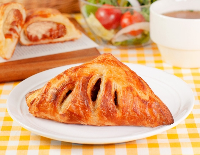 商品特徴:パスタの定番・ミートソースとチーズをサクッと香ばしいデニッシュ生地に包んでこんがり焼き上げました。