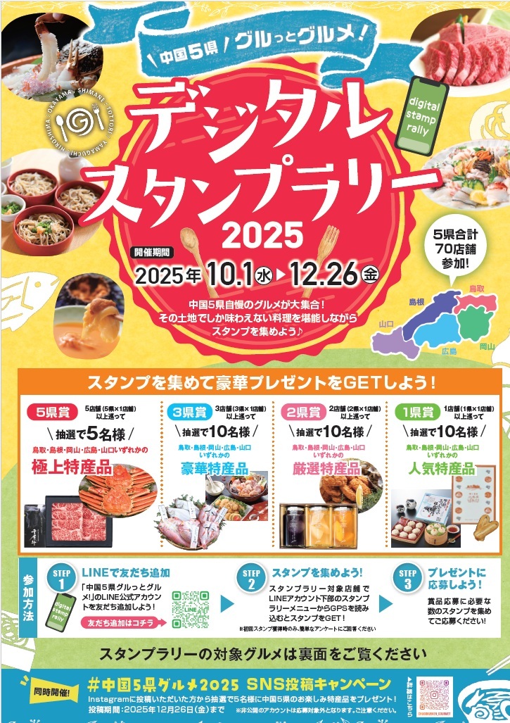 中国5県グルっとグルメ!デジタルスタンプラリー事務局では、中国5県エリアの相互誘客・周遊を促進するため、2025年10月1日(水)~12月26日(金)の期間、「中国5県グルっとグルメ!デジタルスタンプラリー2025」を実施します。