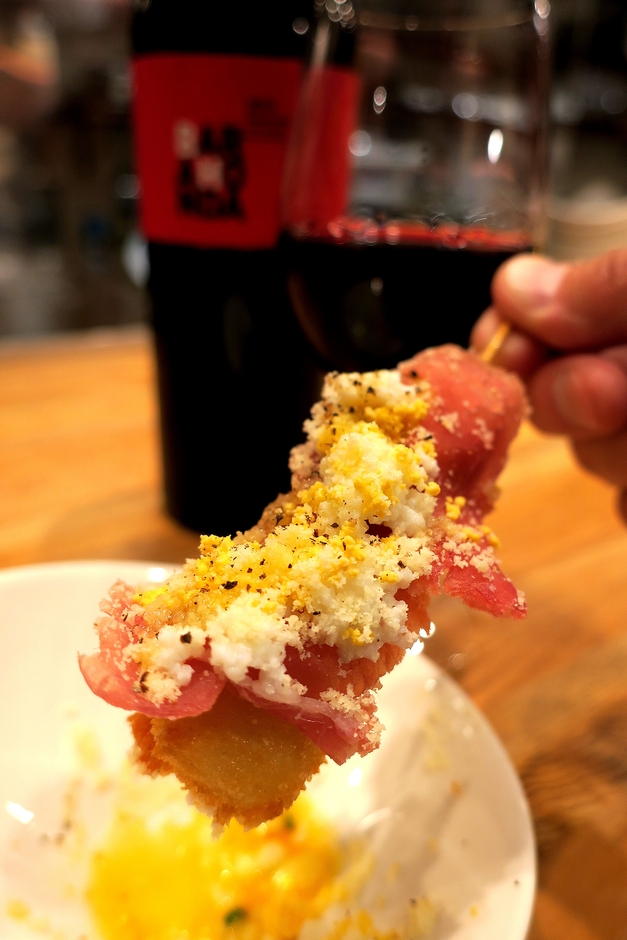 例えば、モッツァレラチーズを生ハムで包み、さらにカラスミを追加した旨味凝縮の一串や、極太のアスパラを贅沢に使い、生ハムに黄色い粒状の卵黄を散らして、ミモザ風にしたりと、一口でイタリア料理が口の中に広がります。