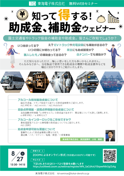 アルコール検知システム、 IT点呼システム、 運行管理システムを開発・販売する東海電子株式会社(本社:静岡県富士市 代表取締役 杉本 哲也)は、 この度、「知って得する!助成金、補助金ウェビナー」を8月27日(火)に無料開催いたします。