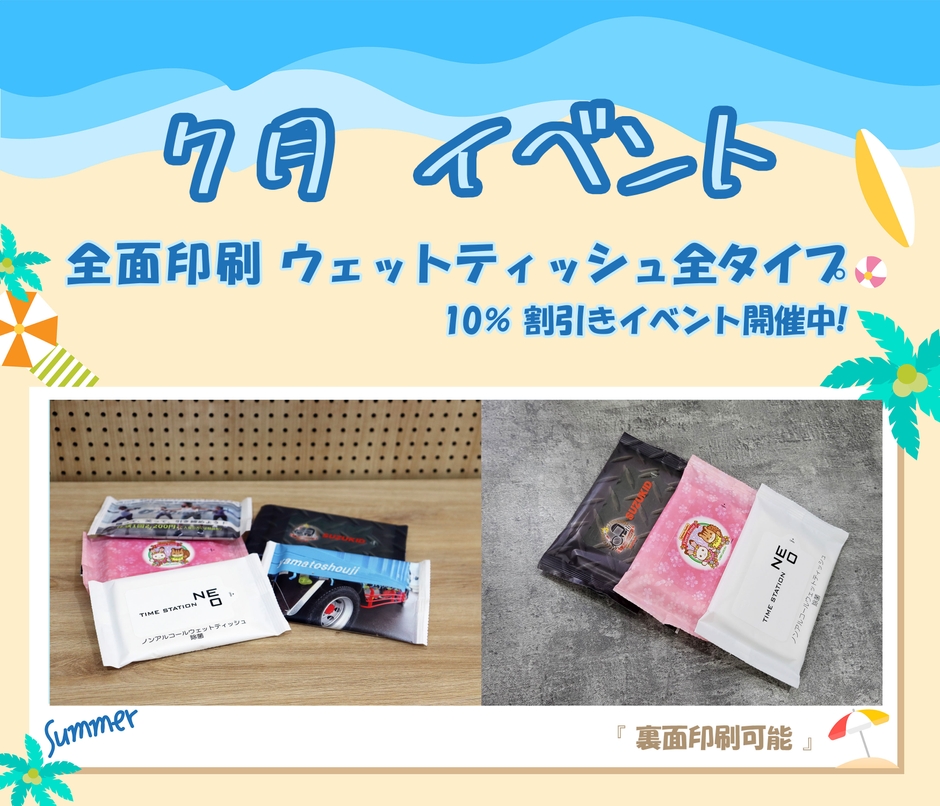 外装フィルムにもオリジナル印刷ができる 全面印刷ウェットティッシュの10%特別割引イベントを 7月1日~7月31日まで実施