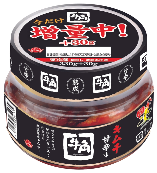 日頃ご愛顧いただいている「牛角韓国直送キムチ330g」の美味しさはそのままに、期間限定で30gの増量を実施します。キムチの本場韓国から直輸入しており、辛さと酸味の中にも甘味のある濃厚な味に仕上げています。0℃以下の凍らない氷温域で貯蔵熟成することで鮮度を保ったまま素材の美味しさを引き出した商品です。本商品は、氷温協会認定商品です。