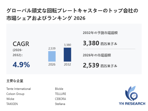 YHResearch調査チームの最新レポート「グローバル頑丈な回転プレートキャスターのトップ会社の市場シェアおよびランキング 2026」によると、2026年の2539百万米ドルから2032年には3380百万米ドルに成長し、2026年から2032年の間にCAGRは4.9%になると予測されています。