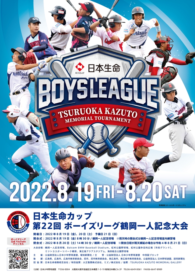 公益財団法人 日本少年野球連盟(所在地:大阪市浪速区、会長:惣田 敏和)は、2022年8月19日(金)~20日(土)に「日本生命カップ 第22回ボーイズリーグ鶴岡一人記念大会」を下記の要領で開催いたします。