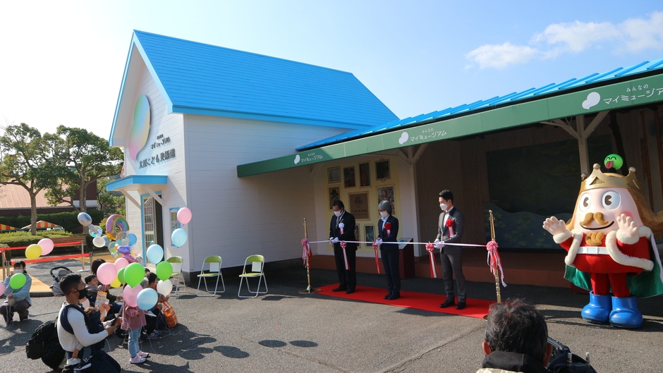 開館初日11月5日には、おもちゃ王国の高谷昌宏社長と大原美術館の大原あかね理事長、現代美術作家渡辺おさむが出席しオープニングセレモニーが行われました。