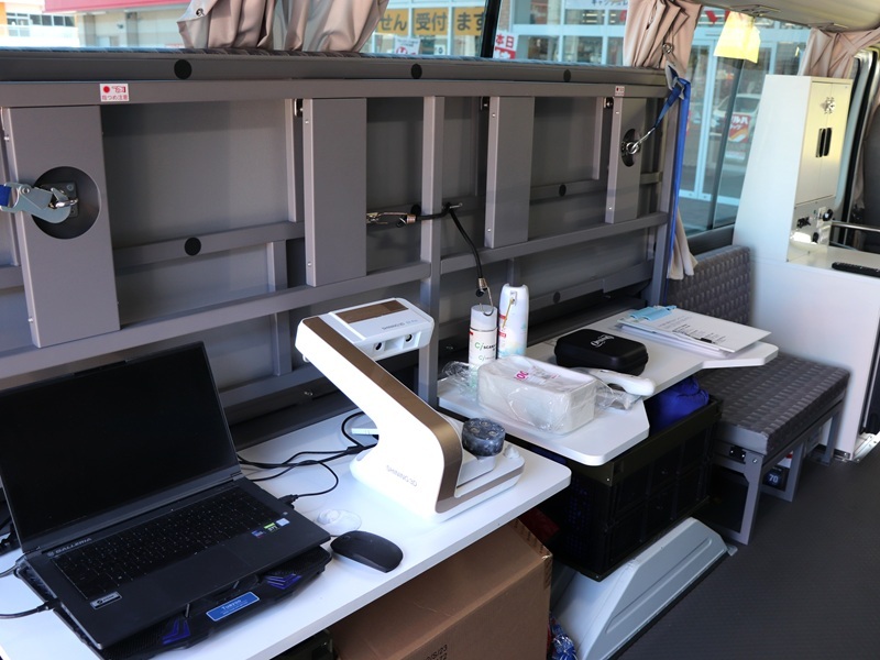 相談会に使用する車両は、今後増加する無歯科医地区へ出向いて車内診療ができるように改良した中古のマイクロバスです。災害時には被災地での治療や電気供給ができるよう、太陽光発電システムを搭載しています。2024年9月より稼働を始め、石狩市の薬局敷地内で無料相談会を実施しました。