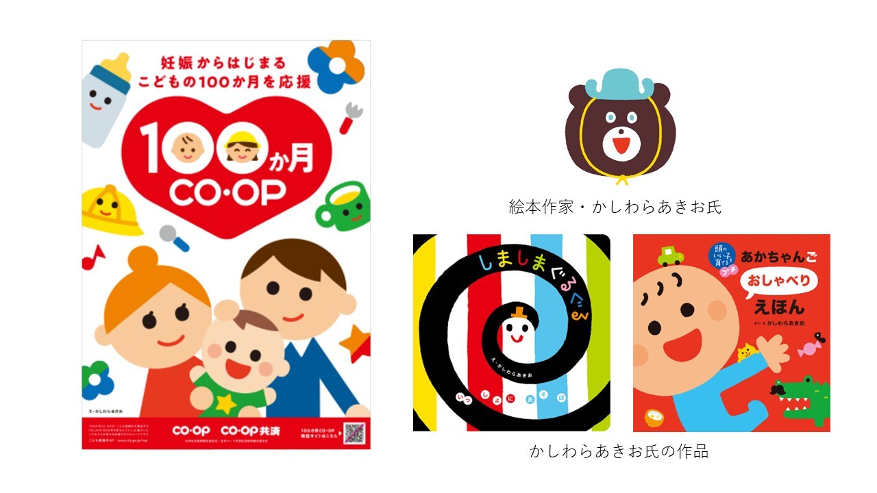 キービジュアルに、『しましまぐるぐる』などの作品で知られる絵本作家・かしわらあきお氏を起用しました。こどもたちに直感的に伝わる表現力で、「100か月CO・OP」の世界観を広く発信します。