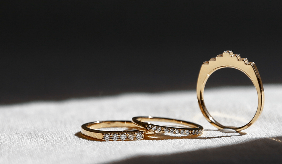 新商品は写真の3種、7石のダイヤが段で連なる「escalier(エスカリエ)」、5石が平面に連なる「Polaire Alison(ポレール アリソン)」、11石がなだらかな曲線に連なる「Parete(パレーテ)」です。