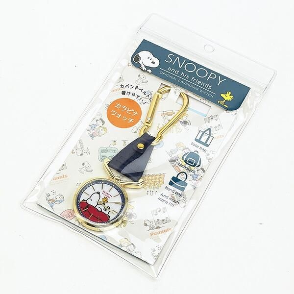 かばんやベルトに付けやすいカラビナタイプの時計です。時計のところになんとも愛らしスヌーピーとウッドストックがデザインされています。かわいらしいのに、ゴールドの部分もあり、高級さと上品さを感じる見た目です。