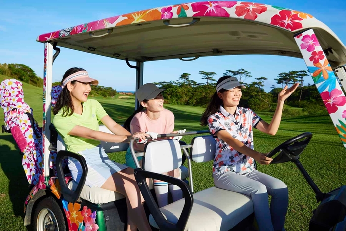 南国カラーのハイビスカスを施したゴルフカートでプレーします。クラブバッグやグローブなども花柄で用意。ゴルフを始めたいけれど、グッズをどう選んだら良いのか分からないという方でも手ぶらでゴルフプレーを楽しむことができます。