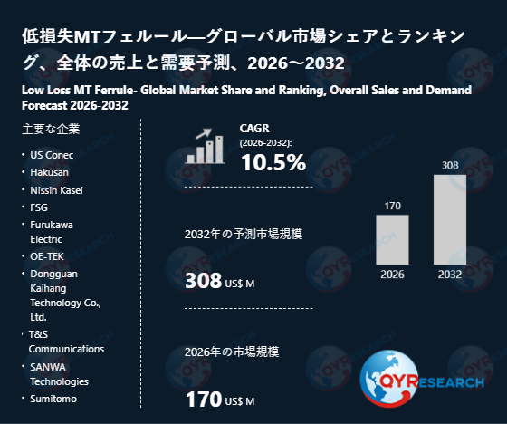 QYResearch調査チームの最新レポート「低損失MTフェルール―グローバル市場シェアとランキング、全体の売上と需要予測、2026~2032」によると、低損失MTフェルールの世界市場は、2025年に158百万米ドルと推定され、2026年には170百万米ドルに達すると予測されています。その後、2026年から2032年にかけて年平均成長率(CAGR)10.5%で推移し、2032年には308百万米ドルに拡大すると見込まれています。