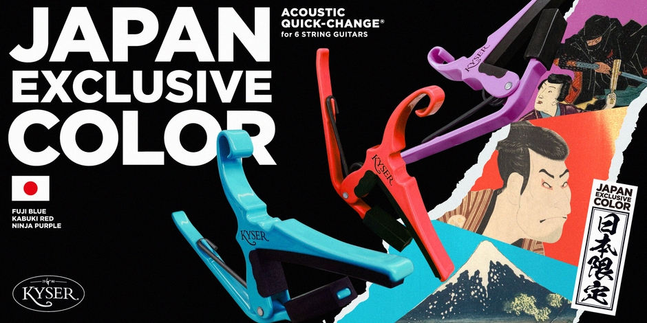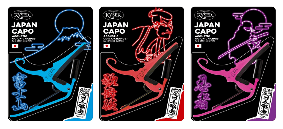 Kyserカポタストを見かけない日本の楽器店はない、と言っても過言ではないほど広く日本のギタリストに愛されているKyserブランド。富士山、歌舞伎、忍者といった日本の伝統的な要素からインスピレーションを受けつつ、モダンなポップさも意識した3つのカラーバリエーション。