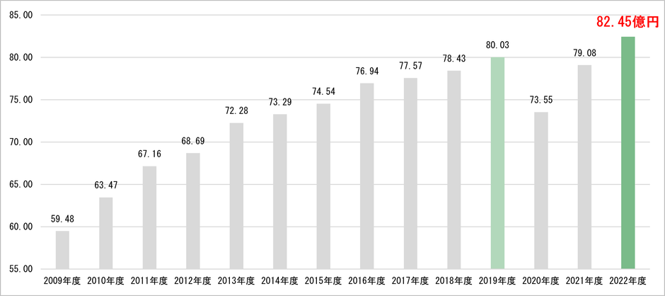 マルヤマクラスは2009年に開業、当初は約59.4億円だった売上が10年連続で増収し2019年度には80.03億円を突破。2020年度は新型コロナウイルスの影響をうけながらも73.55億円と1割ほどの減少にとどまり、2021年度はコロナ前に迫る79.08億円まで回復。2022年度はついにコロナ前の2019年度に記録した最高売上を更新しました。