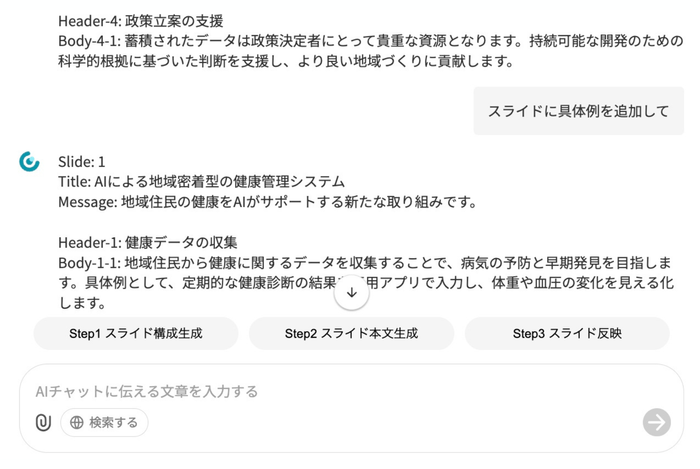 タイトルやポイントとなるテキストを入力すると、AIが自動で文章とスライドを作成し、出来上がったスライドを手直しする程度なので、高い時間削減効果があります。
