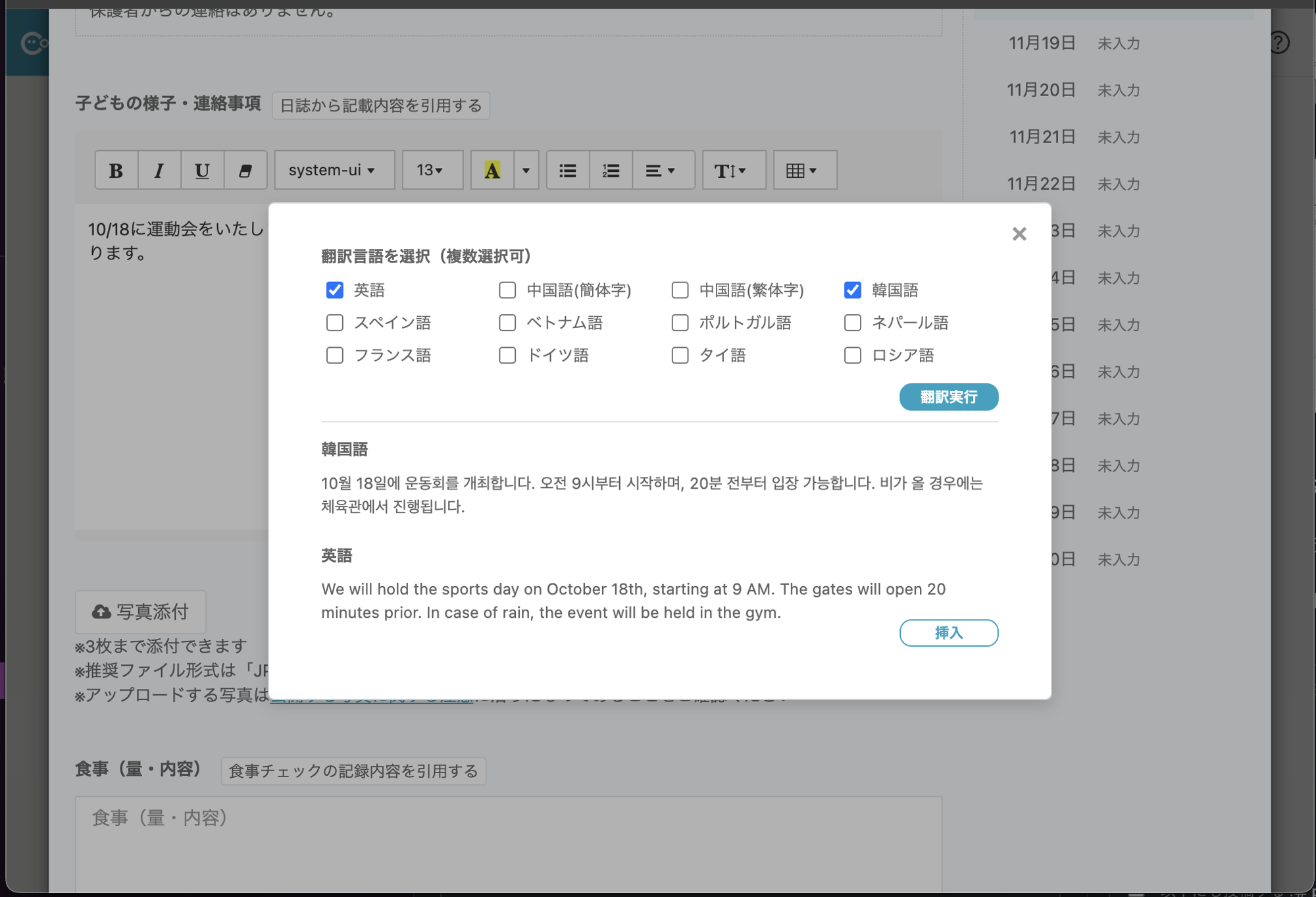 英語、中国語など複数言語に対応した翻訳が可能で、外国籍の保護者への個別対応の負担を大幅に軽減します。