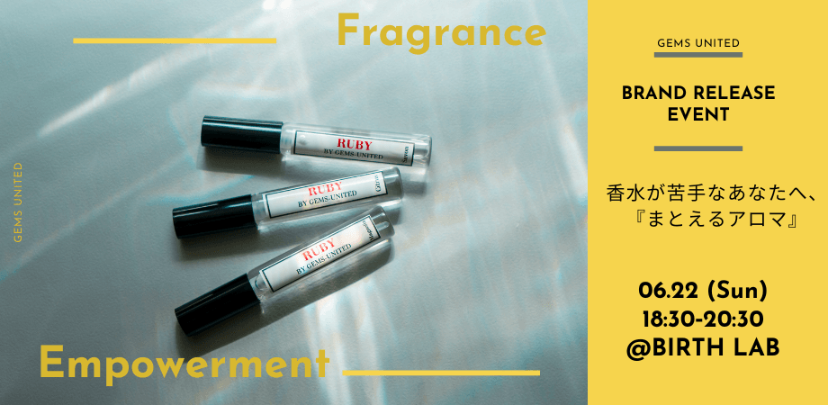 合同会社GEMS UNITED(東京都港区/代表:大曲 加七子)が手がけるフレグランスブランド「RUBY BY GEMS-UNITED」が2025年6月22日(日)にリリースイベントを開催いたします。当ブランドは、元バレエダンサーである代表が、年齢を重ねるにつれて香りに敏感になり、これまで平気だった香水の強い匂いが苦手になった自身の体験から、安心してまとえる香りを求めて立ち上げました。『まとえるアロマ』をコンセプトに、華やかな香りながら、誰でも安心して使えるよう100%天然精油での製造にこだわりました。本イベントは、 香りをまとう体験を通して、自分らしさや小さな自信を思い出すきっかけとなるような、心をそっと後押しするエンパワーメントの場として企画しています。