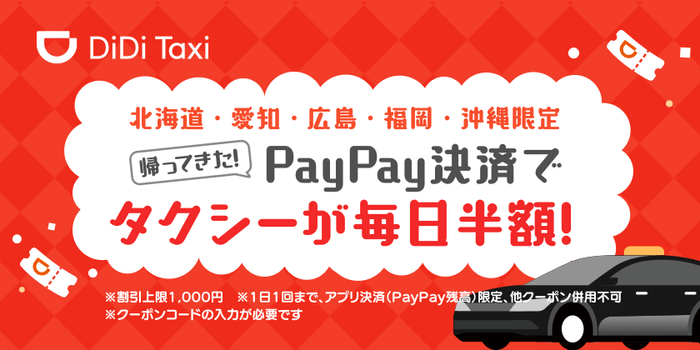 DiDi、北海道、愛知、広島、福岡、沖縄の5都市において PayPay決済でタクシーが毎日半額になるキャンペーンを開催