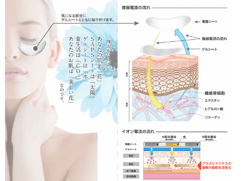 電極シートの金(プラス極)と半導体(マイナス極)が生み出す微弱電流は、肌細胞内の線維芽細胞を刺激活性化し、健康な肌に必要なエラスチン、ヒアルロン酸、コラーゲンを増やします。