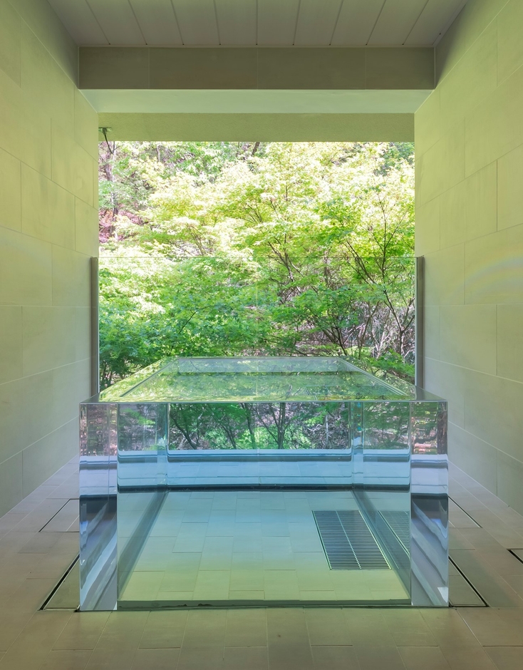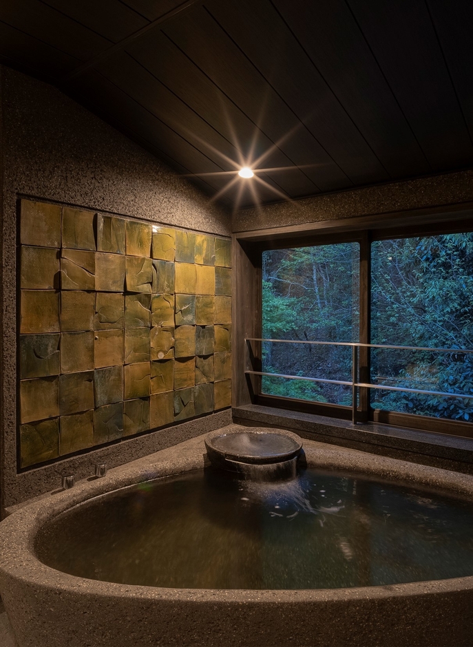 対する地の表象としては、陶芸家・石井直人氏による登り窯の1200度を超える高温で焼かれ変形した破れ壺を、壺の裂け目から揺らめく焔とともに天に対峙させた。加えて左官職人・久住章氏による地に抱かれるような浴槽と、日没の前にひときわ焼ける夕日を思わせる土壁、そして裏山の木々の緑と鏡合わせに石井氏の織部釉の緑の陶板を壁にしつらえ、大地の生命感と死と再生の胎動を表現した空間となっている。