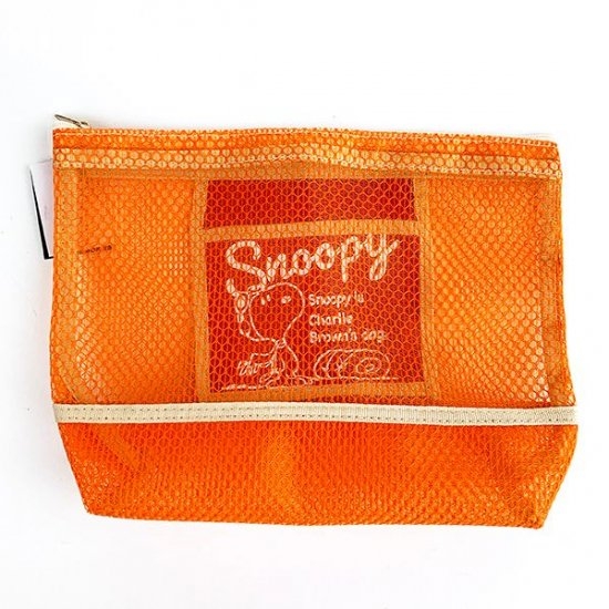 オレンジカラーのメッシュ素材がオシャレな、トートバッグです。内側のポケットにデザインされたフライングエースのスヌーピーが、キュートですよね。