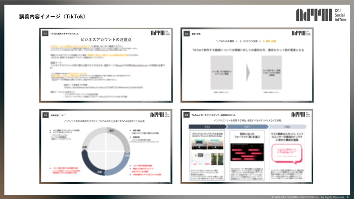 株式会社CARTA HOLDINGSのグループ会社である株式会社CARTA COMMUNICATIONS(東京都港区、代表取締役社長:目黒 拓、以下「CCI」)は、企業におけるSNSマーケティングの課題解決を提供するコンサルティングサービス「CCI Social AdTrim」において、企業の社内研修などに最適な「SNS 基礎勉強会パッケージ」に、「TikTok基礎勉強会パッケージ」を追加いたしました。本プランは、TikTokのオーガニック運用の知見がない、あるいは将来的にインハウス化をご検討されている企業様へ向けて、弊社SNSコンサルタントからTikTokのオーガニック運用の基礎的な勉強会を実施するプランとなります。