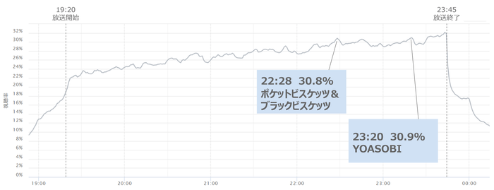 出場歌手の中では、YOASOBIの「アイドル」の後半の多くのアイドルグループが出演している場面が関東で30.9%となりました。また、今回25年ぶりの復活となったポケットビスケッツ&ブラックビスケッツも、全員で歌う場面で関東で30.8%となり、多くの世帯で世代を超えて楽しまれていたようです。