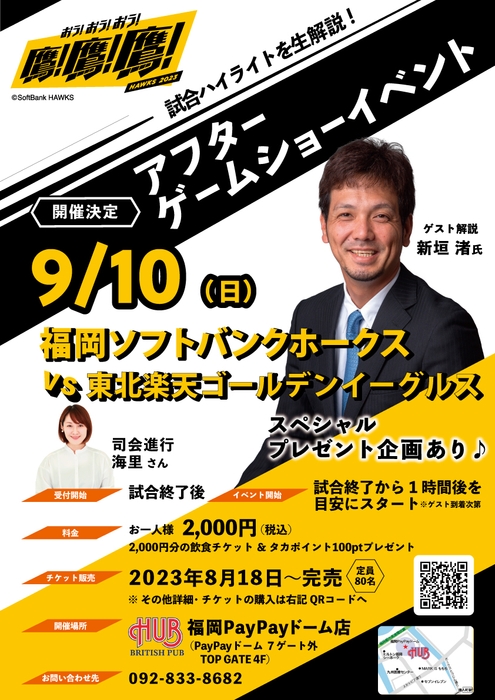 株式会社ハブ(本社:東京都千代田区、代表取締役社長:太田 剛)が運営するHUB福岡PayPayドーム店は、ソフトバンクホークスOB選手による解説イベントを開催いたします。
