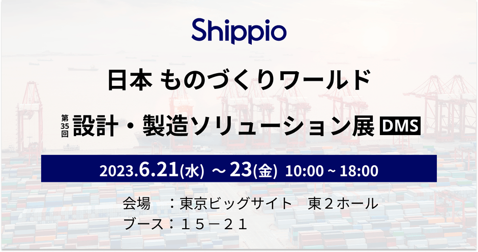 国際物流プラットフォーム「Shippio(シッピオ)」を提供する、株式会社Shippio(本社:東京都港区、代表取締役CEO:佐藤 孝徳、以下 Shippio)は、2023年6月21日(水)~6月23日(金)に東京ビッグサイトで開催される「日本ものづくりワールド2023~設計・製造ソリューション展(DMS)~」へ出展いたします。