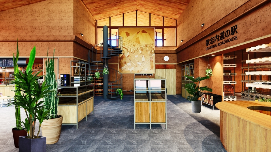 今回のリニューアルでは、「すべてがサスティナブル」をテーマに掲げ、地域の歴史や自然を未来につなぐことを目指します。自然をイメージした緑豊かな内装の店内に、地元の廃材を活用した什器を配置。サスティナブルな雑貨やアロマ商品、観葉植物を扱うショップとホットサンドやスムージー、ハンドドリップコーヒー等を楽しめるカフェを併設します。道の駅だけど今までの道の駅とは一味違う、美味しいものやこだわりの雑貨が集まった心地よい空間。旅行者から地域住民まで、多くの人が繰り返し訪れる場となり、「なんかいいな」と思ってもらえる。そんな、今までにない道の駅を目指します。