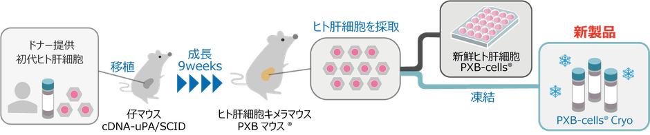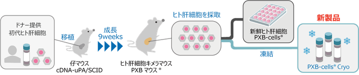 フェニックスバイオは、凍結初代ヒト肝細胞からヒト肝細胞キメラマウス(PXBマウス)を作製する独自技術を有しており、このヒト肝細胞キメラマウスの体内で500~1,000倍に増幅させたヒト肝細胞を効率よく回収する方法を確立することによって、機能性の高いヒト肝細胞を長期に亘り安定供給することを可能としました。
