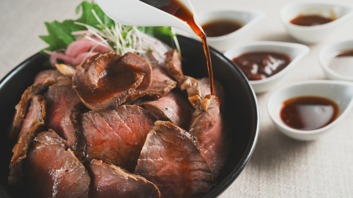ジューシーで甘みのある脂身と赤身のバランスが絶妙な食べやすい淡路牛ローストビーフを使った本メニューは、お客様がお好きな量のローストビーフを取り、自分だけのオリジナル丼を作れるスタイルでお愉しみいただけます。また、本メニューには、ローストビーフ専用のソース6種類を提供。淡路島産いちじくや赤ワイン、バルサミコソースを使用した「イチジクソース」や、淡路島産玉ねぎやニンニク、ショウガを使用した「ステーキソース」、ピリッとした辛さと、後味のさっぱりさが特徴の「ワサビソース」等、味のバリエーションを楽しみながらお召し上がりいただけます。