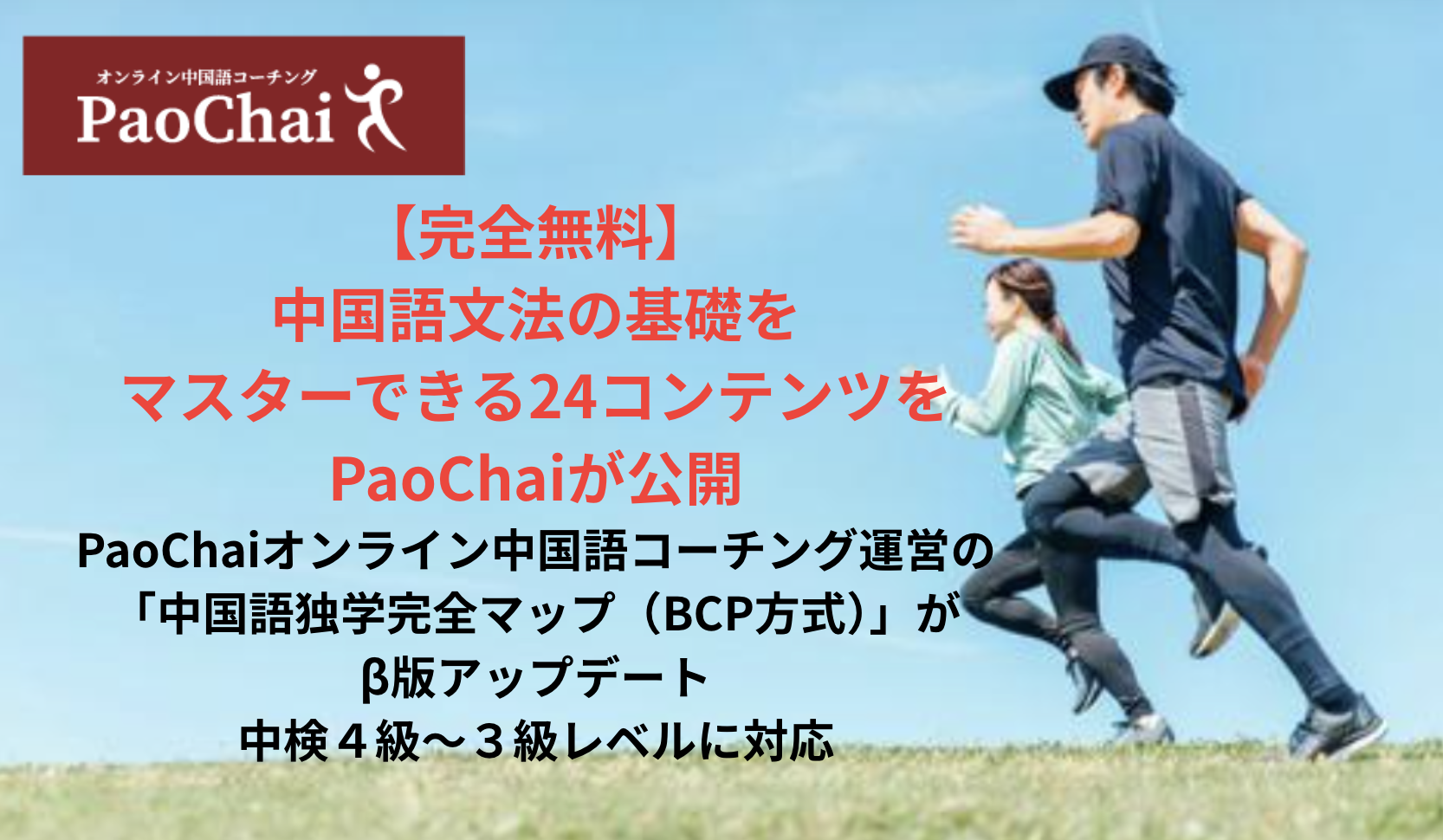 株式会社Rungar(代表取締役:冨江 恭直)が運営する「PaoChaiオンライン中国語コーチング」は、学習者向けロードマップ教材《中国語独学完全マップ(BCP方式)》のアップデートとして、【完全無料】で文法基礎をマスターできる24コンテンツ(β版)を公開しました。