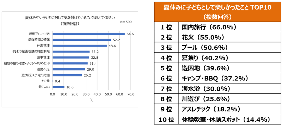 まず、子どもと過ごす夏休みで楽しかったことについて調査。ランキングにしたところ、1位「国内旅行(66.0%)」、2位「花火(55.0%)」、3位「プール(50.6%)」、4位「夏祭り(40.2%)」、5位「遊園地(39.6%)」という結果になりました。