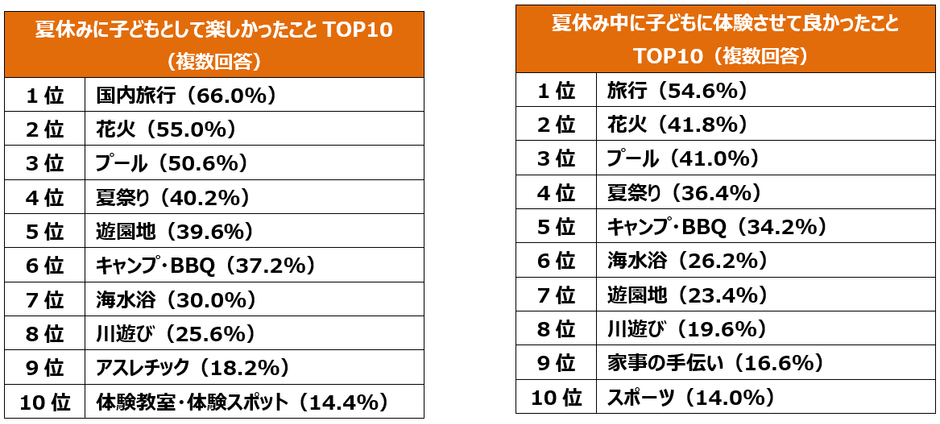 ■1.親子の夏休み、楽しかったこと1位「国内旅行」2位「花火」3位「プール」。体験させて良かったこと1位「旅行」。理由「今のうちにたくさん思い出を作りたい」