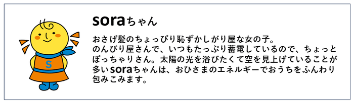 このたびsolanesでは、私たちの想いを形にするブランドキャラクターとして、太陽の国からやってきた双子のヒーロー「sora(ソラ)ちゃん」と「nes(ネス)くん」をお披露目いたします。彼らは、エネルギーを大切に使う暮らしを広めるため、背中のマントで世界中の家々を飛びまわる、心やさしい応援団です。