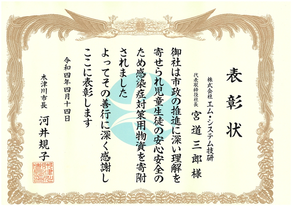 株式会社エム・システム技研(本社:大阪市西成区南津守、代表取締役社長:宮道 三郎、URL: https://www.m-system.co.jp/Japanese/ )は、地域社会への貢献や子育て支援の一環として、当社事業所のある京都府木津川市の小中学校18校に株式会社MGMTのUVC空気除菌機(AT1200UVC)70台を寄付したことをお知らせいたします。また今回の支援を通じて木津川市長から感謝状を受贈いたしました。
