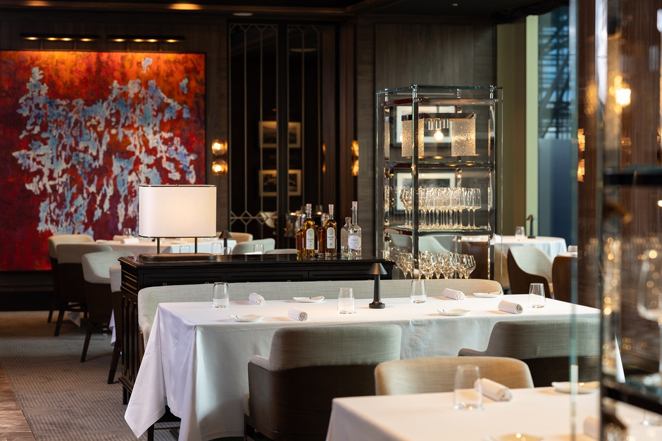 中二階に位置するレストランのエントランスに到着した瞬間からゲストは祝福され、ホテル内の印象的なウォーターフォールを眺めながらアミューズ・ブーシュをお楽しみいただきます。このオリジナルスタイルのウェルカムの後、ゲストはメインダイニングフロアへと案内され、特別な美食体験が始まります。
