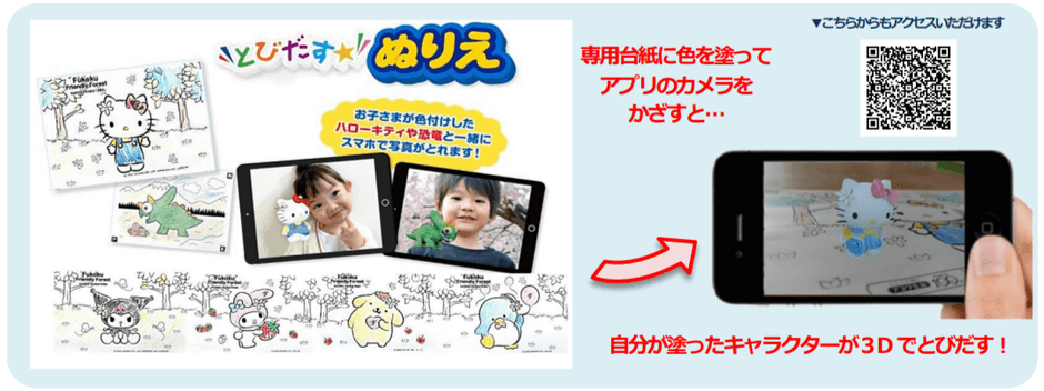 【とびだすぬりえ】(以下、本アプリ)は、お子さまが大好きなぬりえにAR(拡張現実)技術と3D・インタラクティブの要素を加えた“新感覚ぬりえ”アプリです。専用のぬりえ台紙に色付けしてスマホカメラで取り込むと、クレヨンや色鉛筆で塗った質感をそのままに画面上で立体(3Dモデル)となり、AR技術により目の前にキャラクターが飛び出してきたかのような臨場感をお楽しみいただけます。完成した3Dモデルはコレクションしたり自由に動かして遊べるほか、AR機能によりスマホカメラで一緒に写真撮影が出来るなど、従来のぬりえの枠を超えたデジタルならではの楽しみ方でお子さまの想像力や感性を養います。