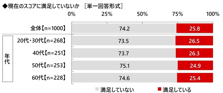 はじめに、全回答者(1,000名)に、現在のスコアに満足していないか聞いたところ、「満足していない」が74.2%、「満足している」が25.8%となりました。自身のスコアに納得していないゴルファーが多いようです。
