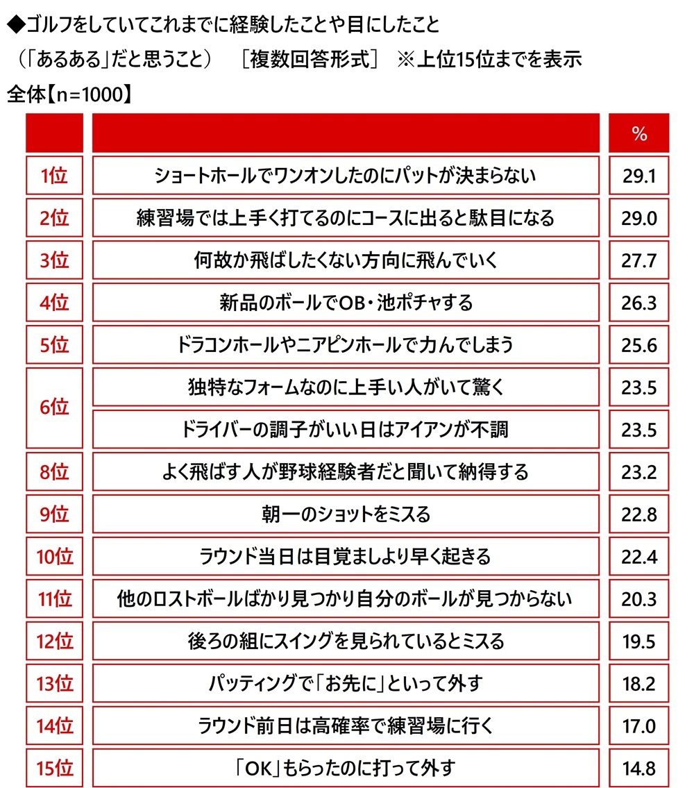 全回答者(1,000名)に、ゴルフをしていてこれまでに経験したことや目にしたこと(「あるある」だと思うこと)を聞いたところ、1位は「ショートホールでワンオンしたのにパットが決まらない」(29.1%)、2位は僅差で「練習場では上手く打てるのにコースに出ると駄目になる」(29.0%)となり、3位「何故か飛ばしたくない方向に飛んでいく」(27.7%)、4位「新品のボールでOB・池ポチャする」(26.3%)、5位「ドラコンホールやニアピンホールで力んでしまう」(25.6%)と続きました。