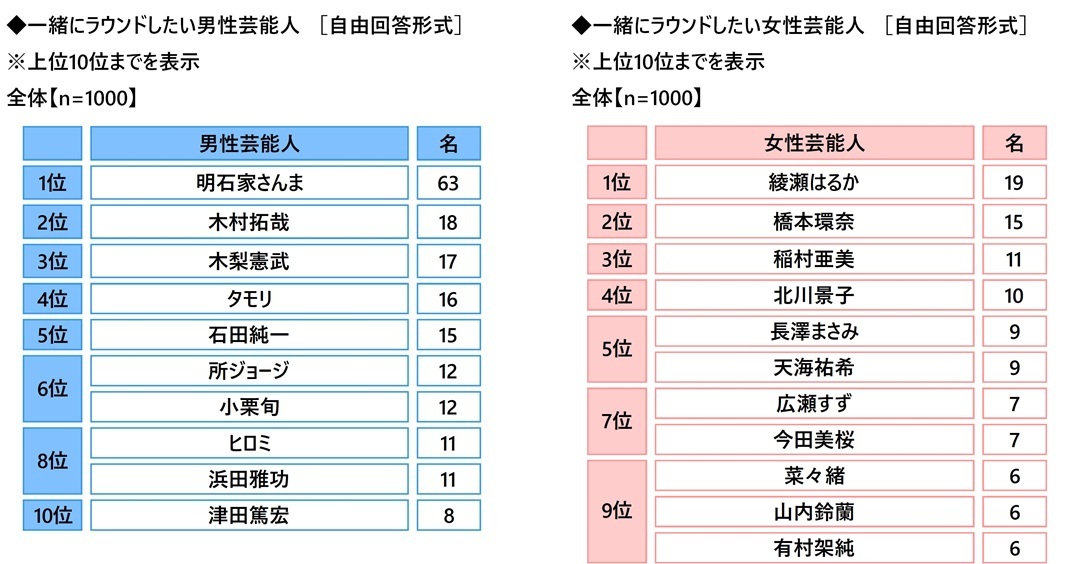 一緒にラウンドしたい男性芸能人を聞いたところ、「明石家さんまさん」(63名)がダントツとなり、2位「木村拓哉さん」(18名)、3位「木梨憲武さん」(17名)、4位「タモリさん」(16名)、5位「石田純一さん」(15名)と続きました。