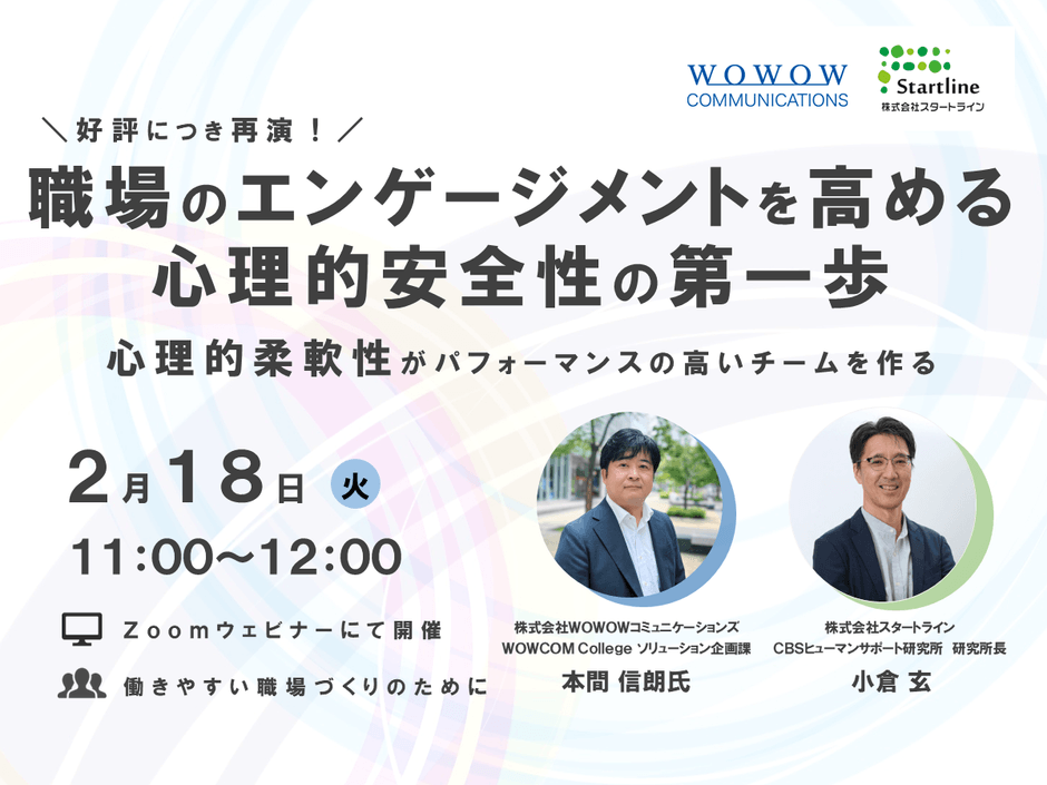 株式会社WOWOWコミュニケーションズ(本社:神奈川県横浜市、代表取締役 社長執行役員:郡司 誠致)は、2025年2月18日(火)に障害者就業支援を通じて“誰もが自分らしく生きる社会”を目指す株式会社スタートライン(本社:東京都三鷹市、代表取締役:西村 賢治)と共催セミナー「職場のエンゲージメントを高める心理的安全性の第一歩~心理的柔軟性がパフォーマンスの高いチームを作る~」を好評につき再演することをお知らせします。