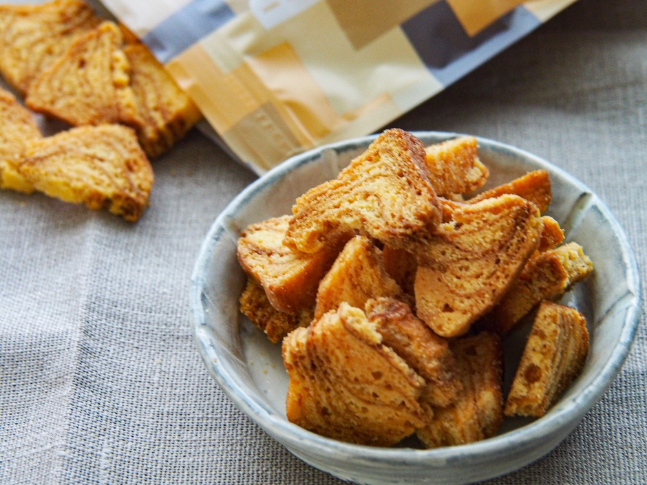 さらに焼き上げたときに一層美味しくなるカットを研究しています。カットすることで食べやすいサイズになりますので、小腹が空いたときに、ティータイムにぴったりです。チャック付きのパッケージなので、小分けにしてお好きなタイミングで食べることができます。
