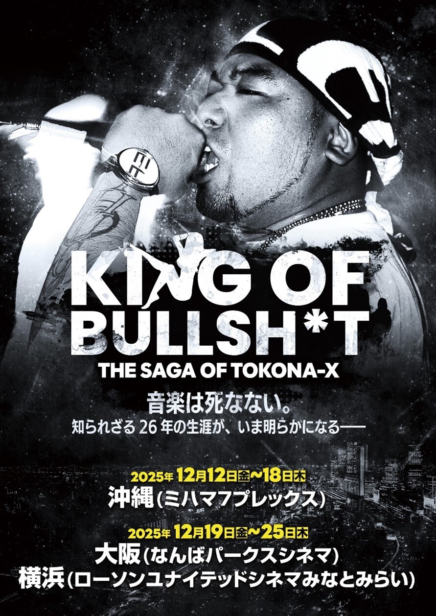 4月と5月に名古屋で行われたプレミアム上映会や限定上映が、即完売&満席になるほど好評を博した日本を代表するラッパーTOKONA-Xのドキュメンタリー「KING OF BULLSH*T-THE SAGA OF TOKONA-X-」(キング・オブ・ブルシット ザ・サガ・オブ・トコナエックス)を12月12日(金)より沖縄(ミハマ7プレックス)、12月19日(金)より大阪(なんばパークスシネマ)、横浜(ローソン・ユナイテッドシネマみなとみらい)で1週間限定の上映が決定しました!