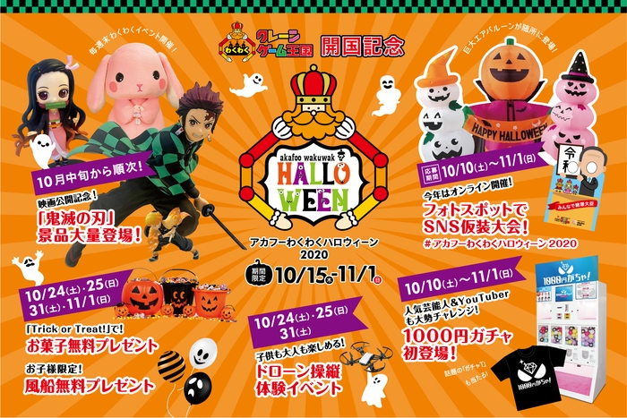 今年のハロウィーンは、大人気アニメ「鬼滅の刃」の映画公開を記念し、人気キャラクターの景品が多数登場。オンラインで開催する「フォトスポットでSNS仮装大会」他、様々なイベントを実施いたします。