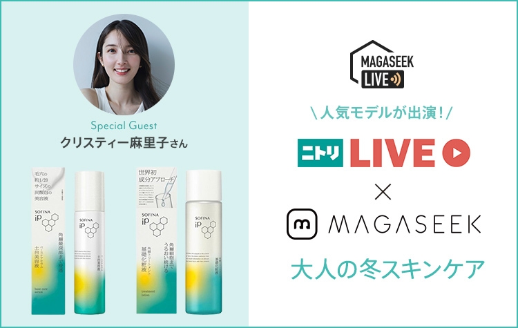 ニトリオリジナルブランド・マガシーク取り扱いブランドから、冬の肌トラブル対策向けのスキンケアアイテムをご紹介いたします。配信には人気モデル「クリスティー麻里子」さんにもご登場いただき、使用感のレビューをしていただきます。