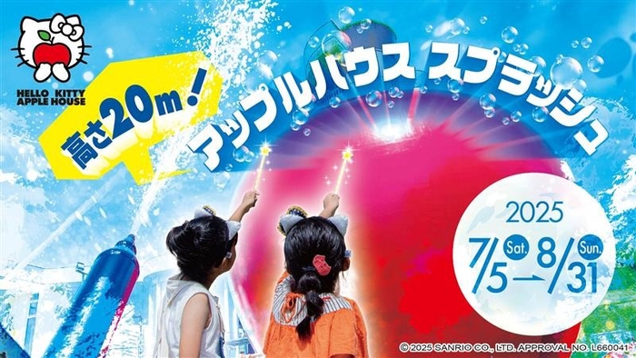 世界最大のりんご型展望シアター「HELLO KITTY APPLE HOUSE」では、大量の水を約20mの高さまで打ち上げる夏季限定イベント『アップルハウス スプラッシュ』を7月5日(土)~8月31日(日)に開催いたします。